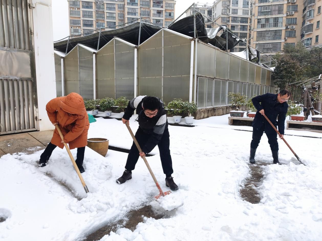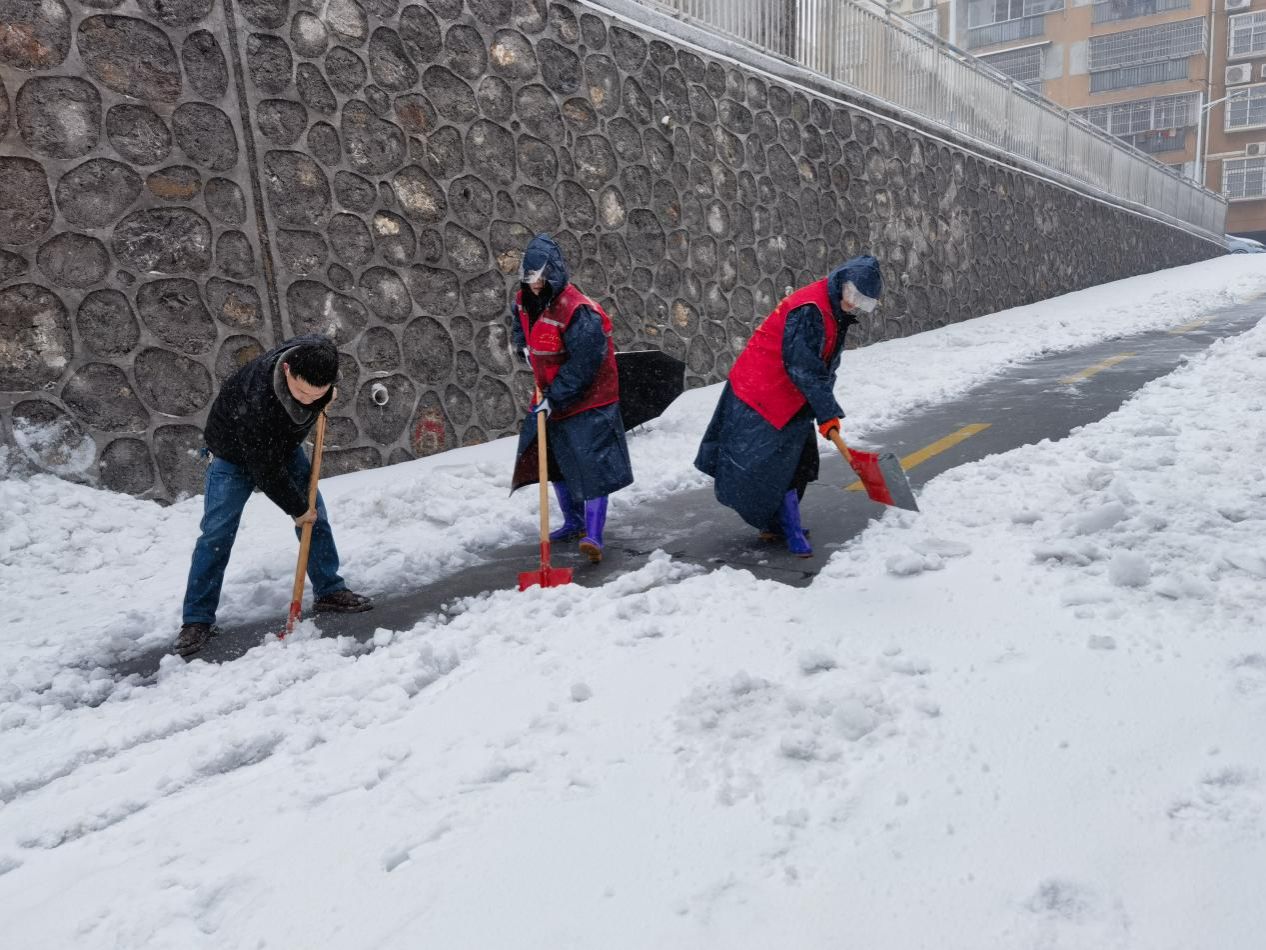 同时,包管社区生活区和生物基地的积雪也得到了及时的清理。各位老师细心地清理道路,搬开积雪,确保了社区居民的安全出行。