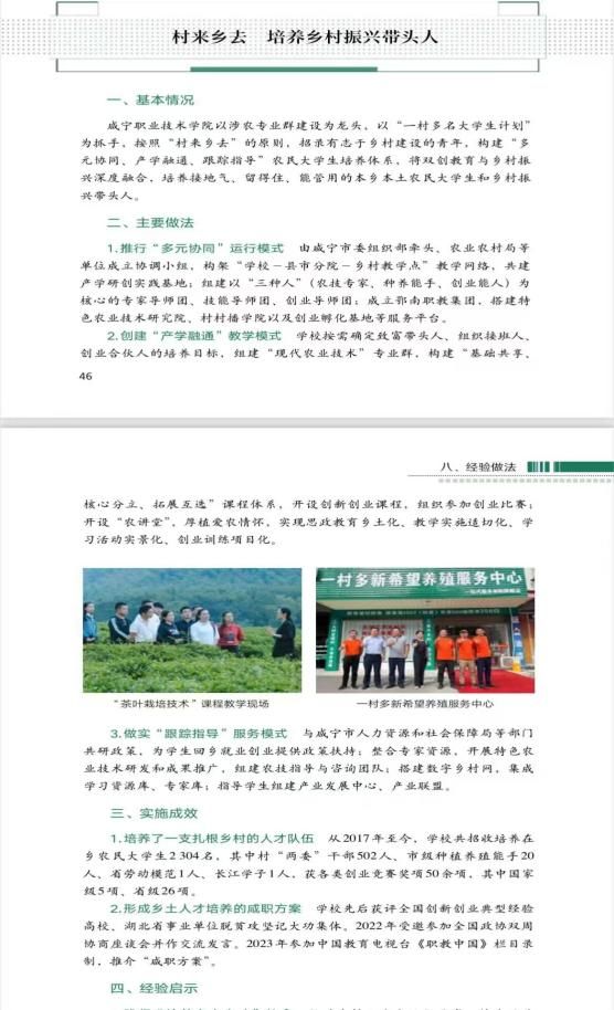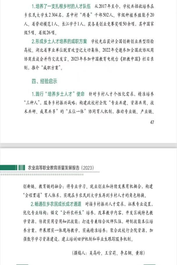 近日,2023年度《农业职业教育发展质量年报》正式发布,我校日韩国产精品(乡村振兴学院)报送的案例“村来乡去 培养乡村振兴带头人”成功入选典型案例。这一殊荣充分展现了我校在农业职业教育领域的教学创新与实践成果,标志着我校农业职业教育水平得到广泛认可。