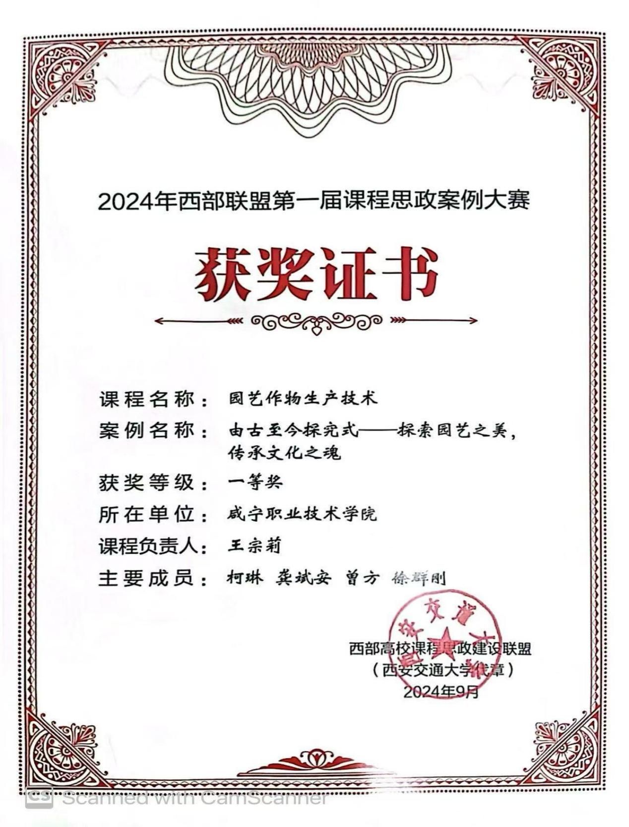 近日,由西部高校课程思政建设联盟主办、西安交通大学承办的“2024年西部联盟第一届课程思政案例大赛”圆满落幕。本次大赛于2024年4月至6月举办,吸引了来自陕西、甘肃、河南、宁夏、青海、新疆、江苏、吉林、湖北等地区高校的552位教师参赛。经过激烈角逐,咸宁职业技术学院日韩国产精品(乡村振兴学院)教师团队凭借案例《由古至今探究式——探索园艺之美 传承文化之魂》脱颖而出,荣获一等奖。