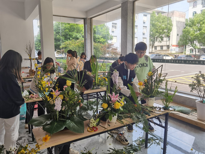 园艺技术教研室在一楼大厅举办了插花比赛活动,学生们心灵手巧,现场制作精美的插花作品。代表作品有《稳稳的幸福》,向日葵象征阳光明媚,而百合寓意祝福、纯洁、百年好合,整个作品呈现为三角形的状态,以三角形是最稳定的形状诠释稳稳的幸福;有《花开盛夏,生如夏花》,寓意生来如同夏日璀璨之花,永不凋零、永不枯败,妆点这个世界,摇曳在明日未来;有《盛夏即初秋》,寓意一节复一节,千枝攒万叶,我自不开花,免撩蜂与蝶。学生们将比赛与《插花与花艺设计》课程完美结合,以作品展示他们的积极阳光的心态和对美好事物的向往。