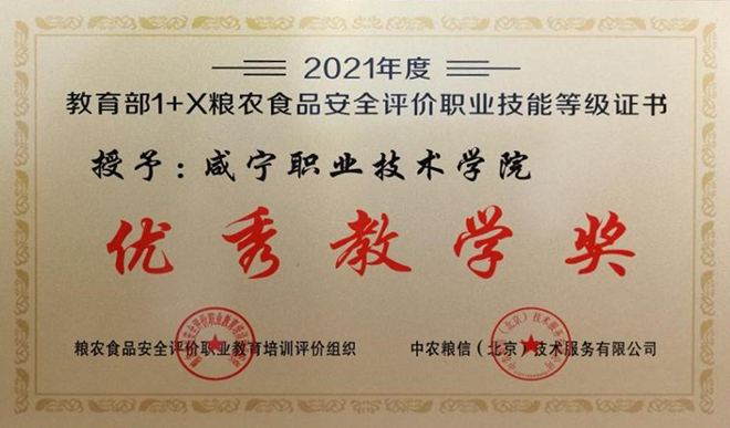 近日,我校获评教育部1+X粮农食品安全评价职业技能等级证书试点工作优秀院校,荣获“优秀组织奖”、“优秀教学奖”和“优秀师资团队奖”。