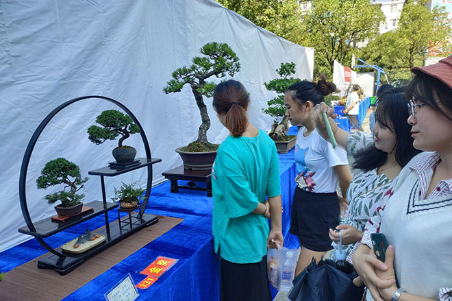 9月27日至10月3日,为庆祝中华人民共和国成立七十周年,咸宁市举办为期一周的“第七届花木盆景根艺赏石展览会”。本次展览会由咸安区区政府主办,27至28日各盆景、根艺、赏石参展展品进驻,29日由以中华盆景大师冯连生为首的国家级大师组成的评奖专家团队依据国家标准,对参战的387件作品进行严格评选,共评出金奖作品4个、银奖作品8个、铜奖作品12个。咸宁职院国家级生物技术实训基地盆景园提供了6件学徒制作品参展盆景,其中侧柏嫁接的台湾真柏作品《盼春归》获得金奖,黄柞作品《盘根错节》获铜奖,获奖率占我校参展作品的33.3%、本次总获奖作品的8.3%。