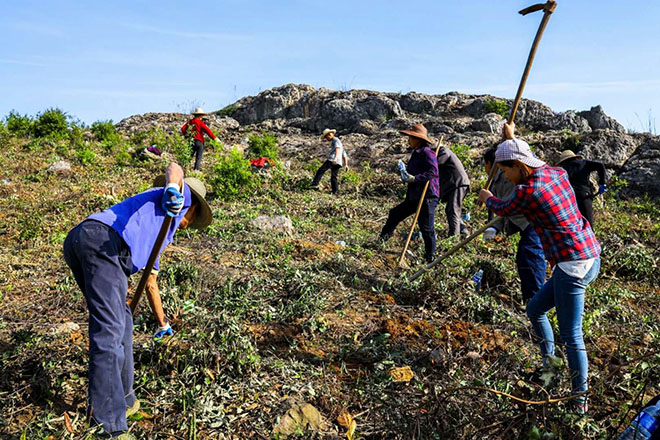 按照心中早已规划无数遍的蓝图,她开启了第一期1000余亩荒山开垦工程,带领50多位村民修路、除荒草。垦荒的不易比她想象的难上百倍,顽固的芭茅草越割越长,雇来挖机深挖除根,待到来年长得更旺盛,用她的话说“除芭茅比打鬼子还难,鬼子打掉一个少一个,芭茅草越割越长、越除越多”。大几十万资金投进去连荒草都治理不了,倔犟的姑娘不信,更不会认输的,她请教技术人员,得到乡镇和县里相关部门帮助指导,用了3年时间反复用各种方法,通过综合治理扼制住疯长的芭茅草。除草的成功,让久违的笑容展露了出来,应了她常用的口头禅:我就不信了。