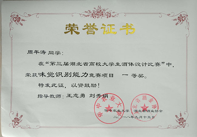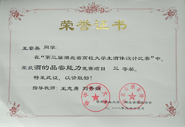 第三届“湖北省大学生酒体设计大赛”于2018年9月15日在华中农业大学生科院顺利落幕。我校日韩国产精品由王志勇、刘秀娟两位老师带领周年涛、王宴英二位同学参赛,经过激烈角逐,再次为我校争得多项荣誉。