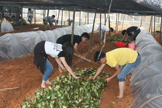 本次实训是基于真实生产场景、真实生产任务驱动、真实工作过程导向的生产性实训。实训由蒋家和、冯律君、李名钢、阮长海等老师指导, 12园艺班、13园艺班分别要完成红花檵木、毛杜鹃、红叶石楠(共约40000株)1畦地苗木的扦插繁殖任务。实训过程中,老师和同学都发挥不怕苦不怕累的精神,风雨无阻,参与插床整理、荫棚搭建、插条的采集、插穗的制作、扦插、浇水、覆膜、插后管理等生产流程,保质保量的完成各个环节。