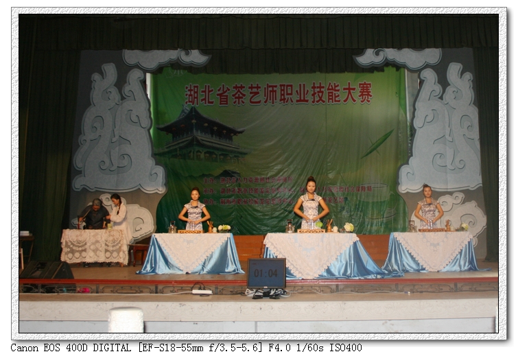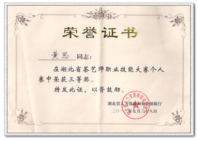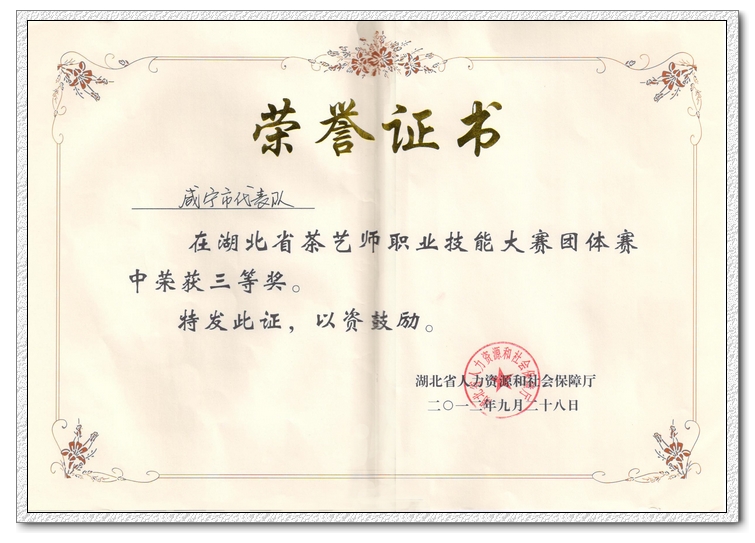 由湖北省人力资源和社会保障厅主办,湖北省职业技能鉴定指导中心、荆州市人力资源和社会保障局承办,荆州市职业技能鉴定指导中心协办的湖北省第三届茶艺师职业技能大赛,于2012年9月27——28日在荆州沙市川主宫举行,省人力资源和社会保障厅副厅长张建平出席开幕式并讲话。本次大赛设个人奖项和团体奖项,个人赛取前十名设奖,团体赛取前六名设奖。