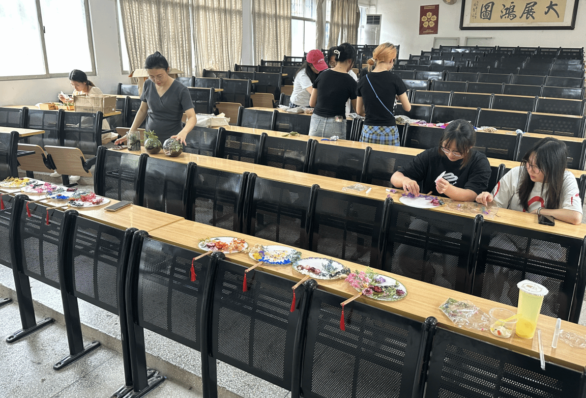 同学们在学习中秋传统习俗知识的同时,传承非遗文化,开展非遗手工制作。同学们用秋季花草、果实标本等材料制作出小纸扇、小香包、盆景等手工。同学们互相分享自己的作品,活动现场气氛活跃,其乐融融。