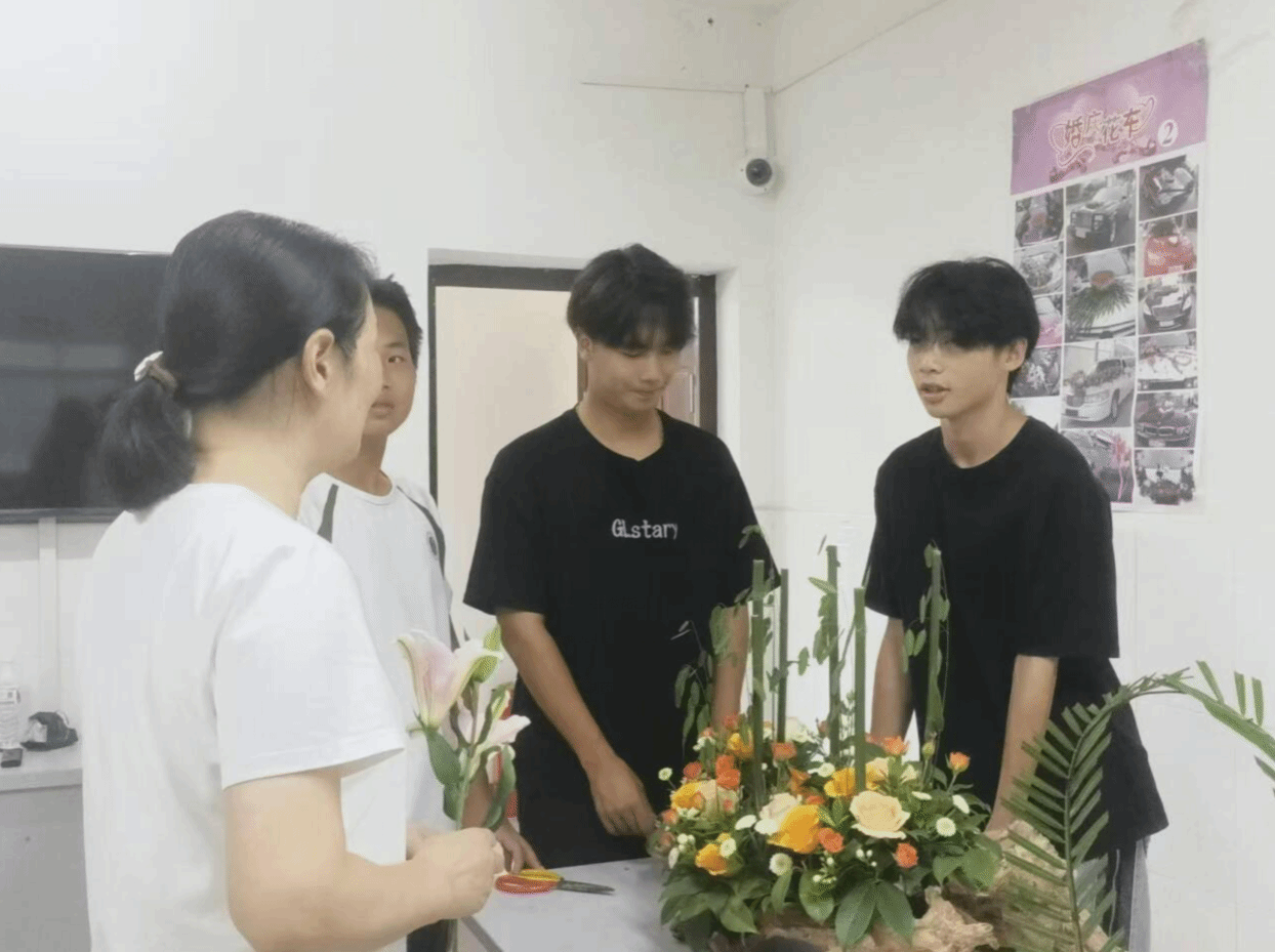 学生们在专业老师的指导下,掌握了高低错落、疏密有致的插花技巧,修枝叶、放花泥、摆造型……大家精心构思、巧妙搭配,把自己的创意和想法通过一朵朵鲜花呈现出来。学生在亲手制作插花过程中感受到传统文化的魅力,也寄托了他们对家人和朋友的思念与祝福。