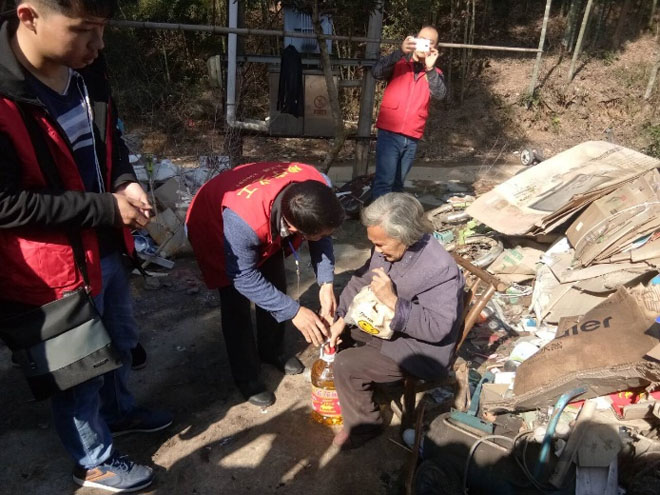 志愿者将慰问品送给老人