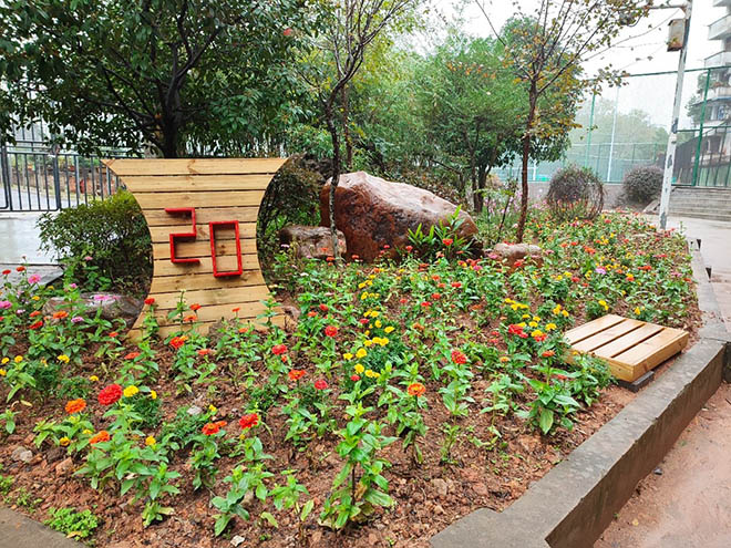 经过两天的改造,花坛面貌焕然一新。花坛左边立着一个木架结构,上面镶嵌了红色大字“20”,寓意庆祝党的二十大胜利召开;花坛最里沿是粉红色波斯菊,使人心情愉悦;中间是黄色飘带状孔雀草,代表秋的收获;外面是深红色的百日草,寓意我校发展红红火火。花坛外沿放置两张木制凳子,可以让学生小憩时感受大自然的芳香。