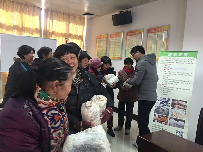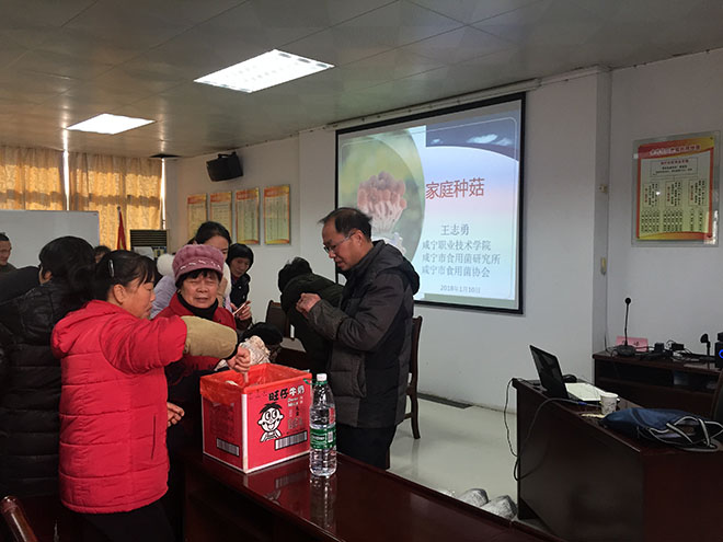 2018年1月10日,咸宁市食用菌研究所、咸宁市食用菌协会、咸宁市食用菌工程技术研究中心负责人王志勇教授,携刘秀娟老师、陈海霞老师等一行五人赴咸宁社区科普大学金叶社区教学点进行蘑菇定制和食用菌家庭种植科普宣传。