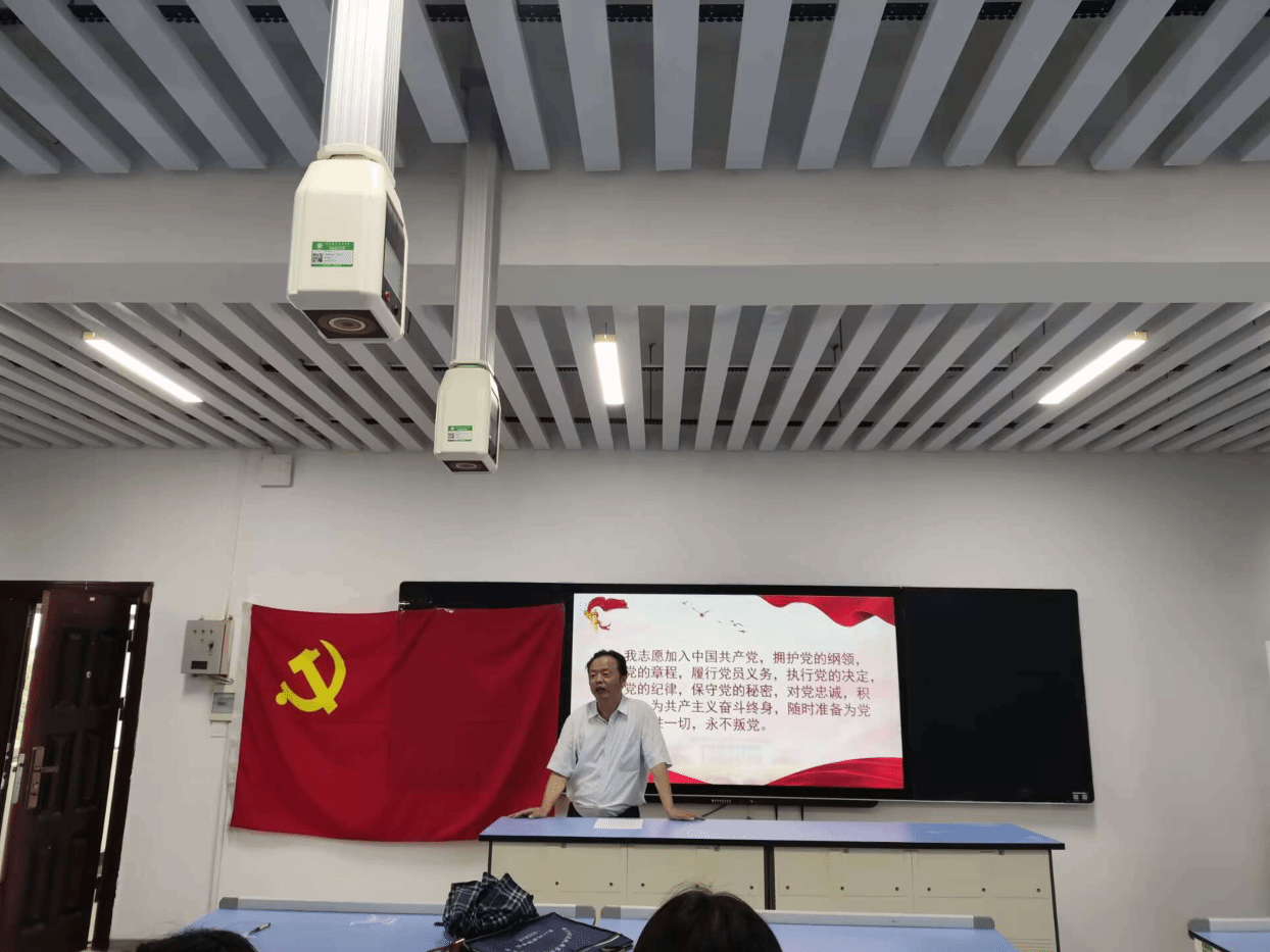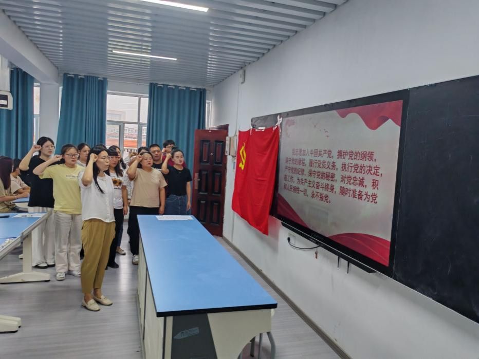 随后,新发展党员代表严雨静、王明同志发言。代表新入党的同志向党组织作出承诺,将不断加强党性修养,在奋斗中不断成长,在进取中永葆活力,充分发挥模范带头作用。入党积极分子代表郭双同志在发言中表示,将会以身边优秀党员作为学习榜样,用共产党员的标准要求和鞭策自己,努力克服自身缺点,期待在党组织的精心培养和老师同学们的关心帮助下,成为一名光荣的共产党员。