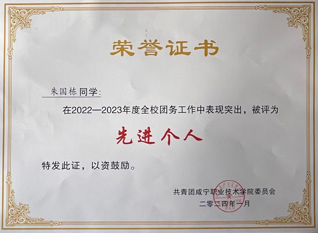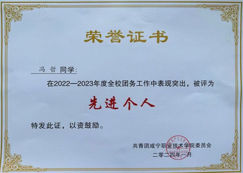 1月5日,鉴于我院团总支组织部在2022——2023年度全校团务工作中表现突出,经共青团咸宁职业技术学院委员会评议,我院团总支组织部获评为“优秀业务单位”、两名干事获评“先进个人”称号。