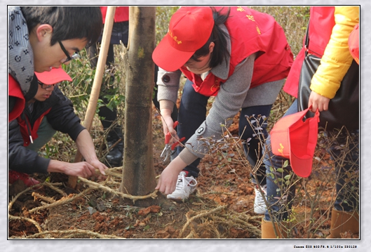 78名志愿者均来自我院生物工程系园林专业,从搬运树苗、修剪、挖坑、栽植、浇水一个完整的过程,志愿者们任劳任怨一丝不苟地完成。带土球的树苗重达六七十斤,有些学生直接扛上肩,不怕脏、不怕累。劳动中众多同学汗流满面,没有一个学生叫苦,没有一个学生提前退场。院长助理陈为民副教授作为专业教师亲临现场,自始至终与学生在一起劳动,并作示范和讲解。