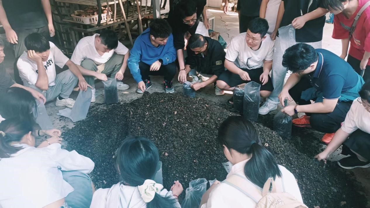 王志勇介绍了食用菌基地相关专业器材,并进行演示、操作,生动形象地向同学们科普了用油茶壳制作菌棒培养灵芝等菌类的各种益处,使大家对循环农业有了初步的认识。