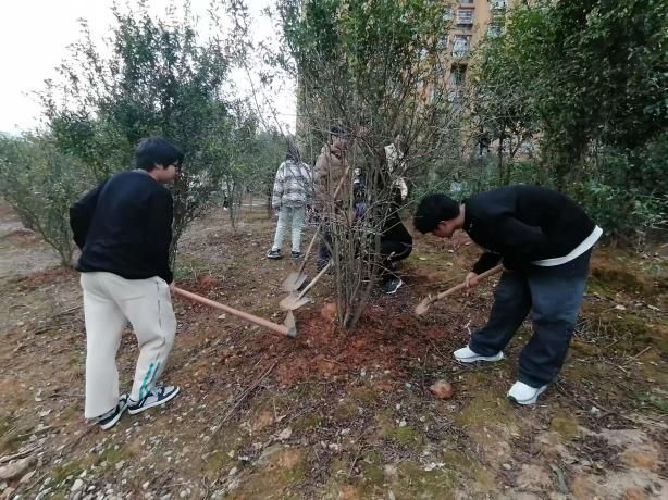 社团负责人孟心悦将志愿者分为若干个小组,每组3-5人。有的负责修剪石榴树上的枯枝和基部分蘖,有的负责挖穴,有的负责施肥,有的负责浇水。男生志愿者主动挖穴、浇水,女志愿者负责施肥,除草。大家分工协作,在劳动中体验团队协作的力量,在劳动中锻炼技能技术,很快完成了任务。