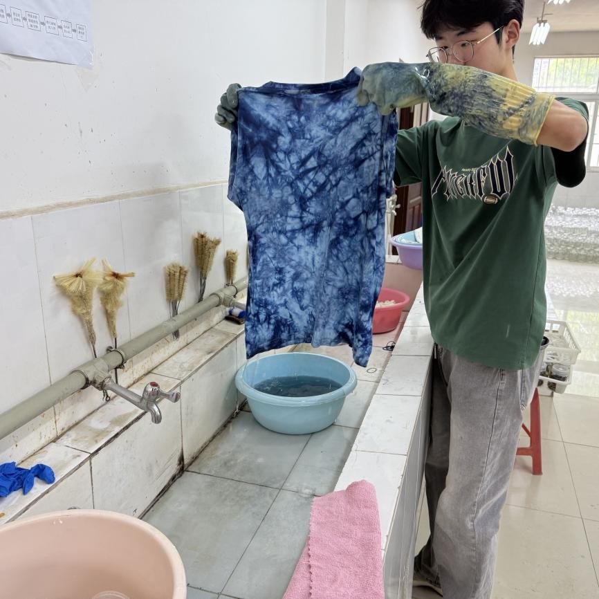 实践创作阶段,学生们严格遵循“设计—扎结—染色—氧化”工艺流程,在素白织物上演绎非遗技艺的现代转化。当百余件扎染作品悬挂晾晒时,冰裂纹、鱼子缬等传统纹样与学生们的创意交织共生,形成“千扎万染不易成,一池深浅见匠心”的生动图景。