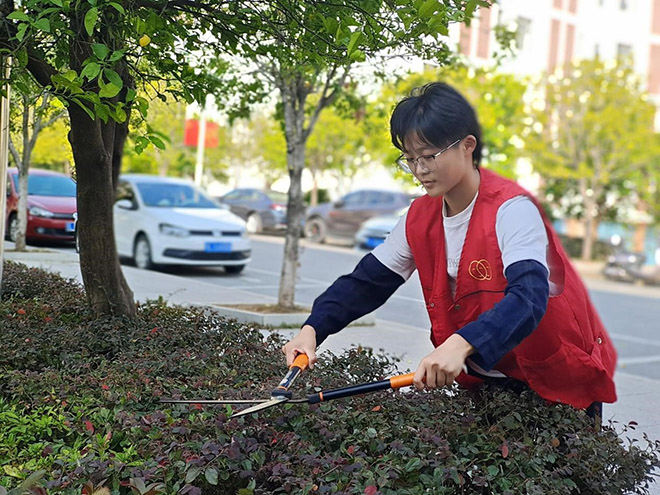 社长翟静悦给志愿者分配任务,全体志愿者分为8个小组,各负责一个区域。志愿修剪沿着南门主干道、丹凤美食城、十四栋学生宿舍一直到行政楼。修剪过程中志愿者们积极配合,相互比拼,在劳动中美化校园,在实践中提升技能。