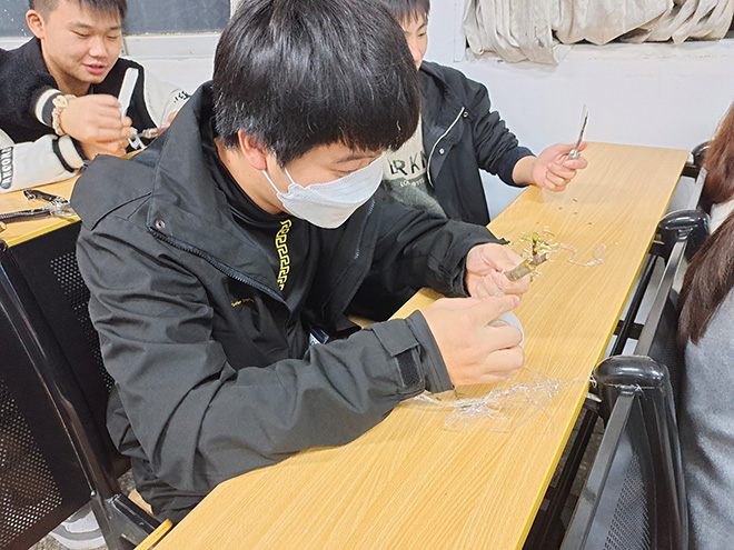社员们听得津津有味,一边学习,一边现场练习嫁接。大家互帮互助,共同进步。社员学习积极性很高,许多社员将嫁接好的枝条拿到徐群刚面前请他现场点评。徐群刚认真点评,表扬了做得好的学生,同时指出了不足之处。他鼓励社员要刻苦钻研,勤于总结,加强训练,提高技能,并预祝参赛人员都能在即将到来的比赛中取得优异的成绩。