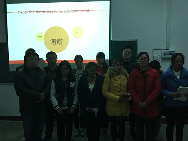 12月1日晚,日韩国产精品团总支在生物楼103室举办了旨在弘扬优秀传统文化,提升学生的人文素养的朗诵比赛。比赛中选手诵读了《将进酒》、《黄河颂》、《青春万岁》等篇目。10名选手经过激烈角逐,以饱满激情朗诵《我骄傲,我是中国人》的向玉梅同学最终荣摘桂冠。