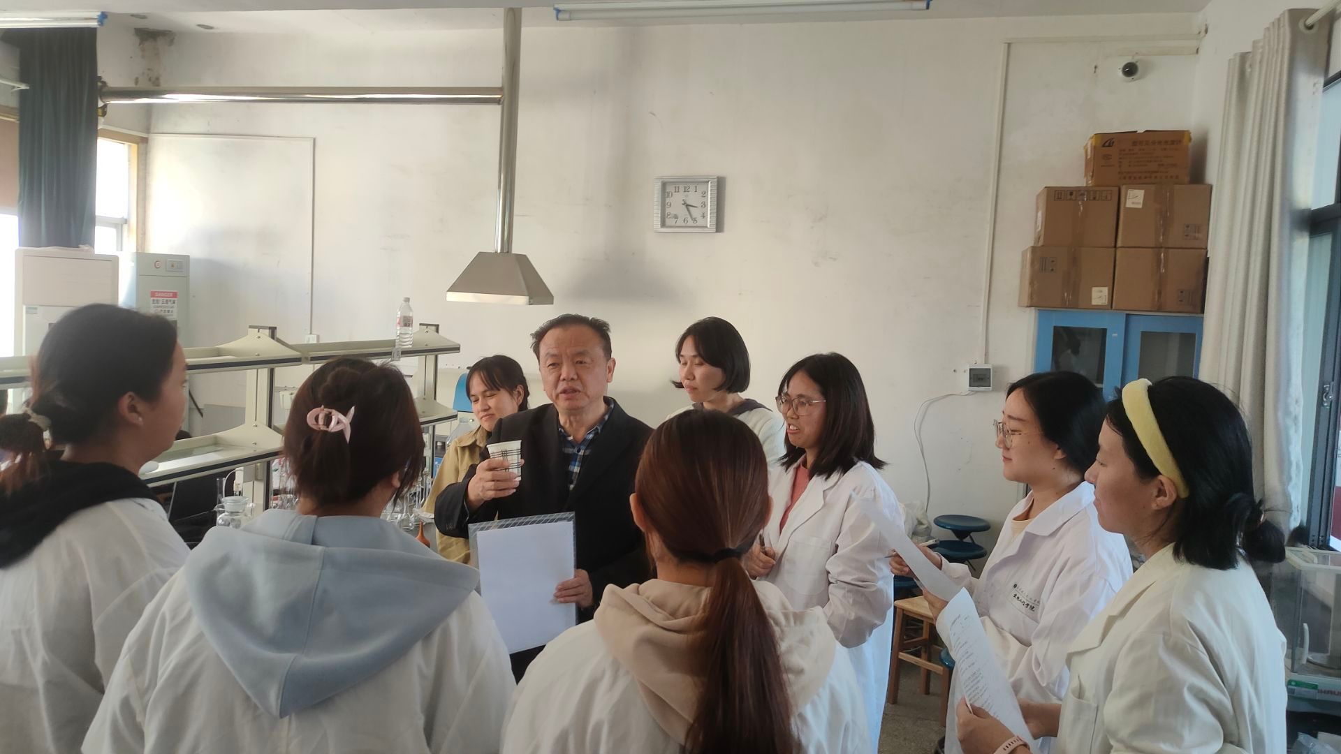 首先,一行人到生物楼202观摩了食品安全与质量检测赛项,项目主题为“果蔬中亚硝酸盐含量的测定”。该项目主要考核学生对照“GB5009.33-2016”国家标准,运用紫外分光光度法完成黄瓜中亚硝酸盐含量的测定。竞赛过程中,学生完成了黄瓜样品预处理、硝酸盐标准曲线工作液的配制、新紫外仪的使用及数据处理等任务。学生整体技能操作较规范、且具备较高的解决问题的能力。