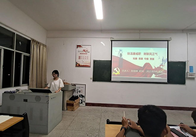 为树立廉洁的工作作风,让廉洁的意识深植根于心,9月28日晚,我院开展了“创廉洁咸职,树新风正气”的主题班会活动。班会由助理辅导员刘佳林主持,全体21级新生辅导员及新生参与。 刘佳林做分享 刘佳林分享了“廉洁...